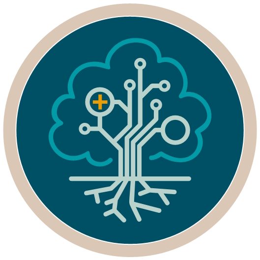 Die Wurzeln und Äste bilden ein Netzwerk deren unterschiedlich verästelten Pfade für ein gesundes Ganzes oder für eine angestrebte Verbesserung (symbolisiert durch das Plus) sorgen, ähnlich wie im Gehirn.